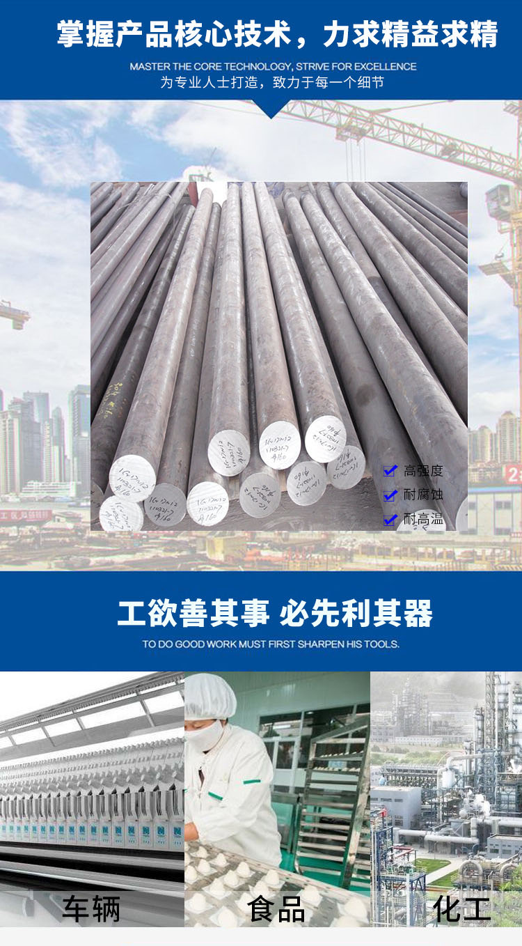 316不銹鋼棒應用前景廣闊,被廣泛用于五金廚具、造船、石化、機械、醫藥、食品、電力、能源、建筑裝潢、核電、航空航天、軍工等行業!。海水里用設備、化學、染料、造紙、草酸、肥料等生產設備;食品工業、沿海地區設施、繩索、CD桿、螺栓、螺母。316不銹鋼棒按生產工藝分可分為熱軋、鍛制和冷拉三種。熱軋不銹鋼圓鋼的規格為5.5-250毫米。其中:5.5-25毫米的小不銹鋼圓鋼大多以直條成捆供應,常用作鋼筋、螺栓及各種機械零件;大于25毫米的不銹鋼圓鋼,主要用于制造機械零件或作無縫鋼管坯。316不銹鋼棒分為316L不銹鋼圓棒,904L不銹鋼方棒,904L不銹鋼光亮棒904L 國內牌號00Cr20Ni25Mo4.5Cu.隨用途而異。C含量<=0.02%或0.03%.具有較高的鉻含量和足夠的鎳含量,銅的加入使它具有很強的抗酸能力,尤其對氯化物間隙腐蝕和應力腐蝕崩裂有高度抗性